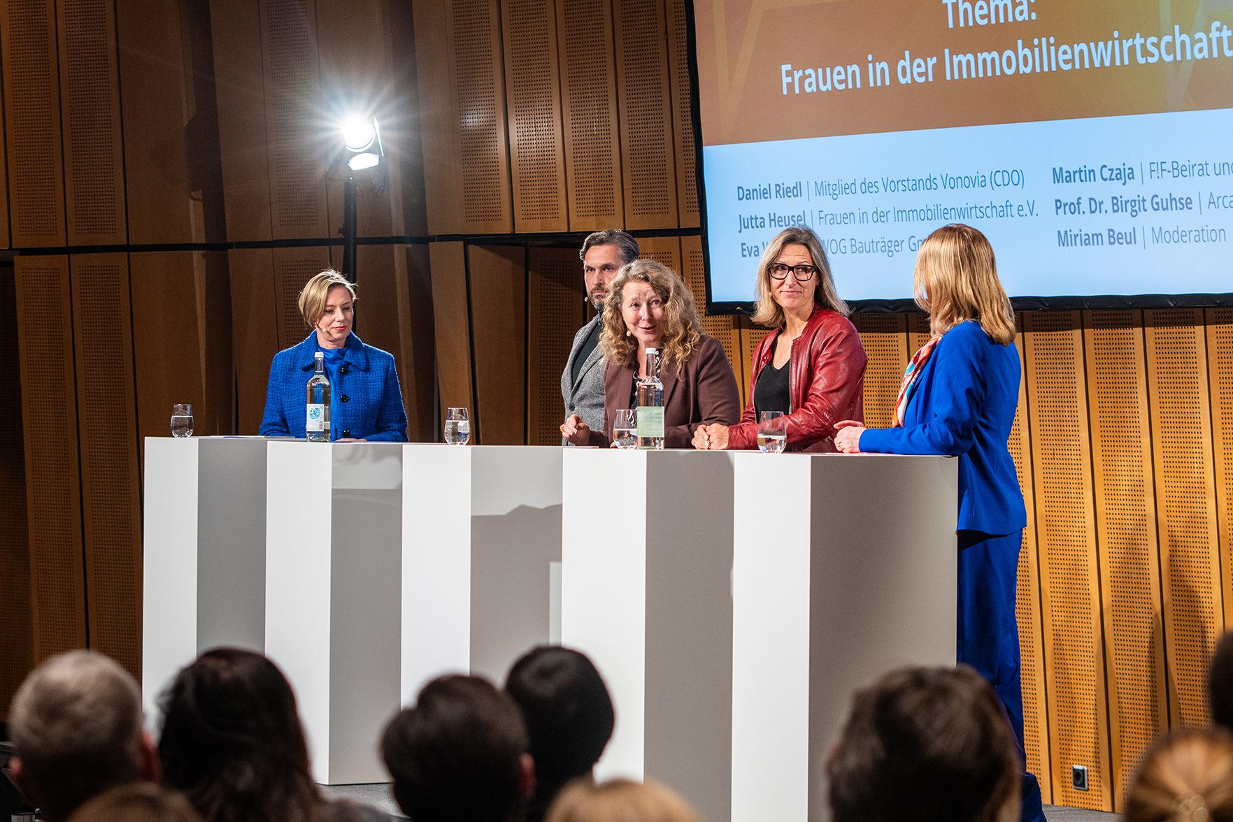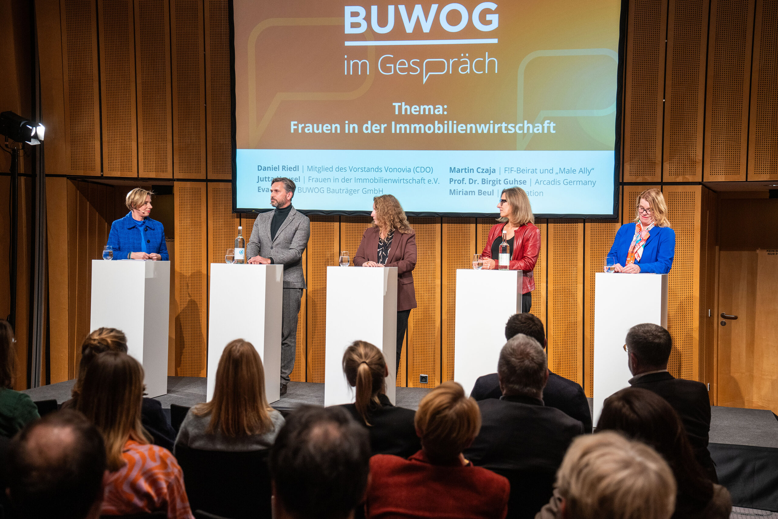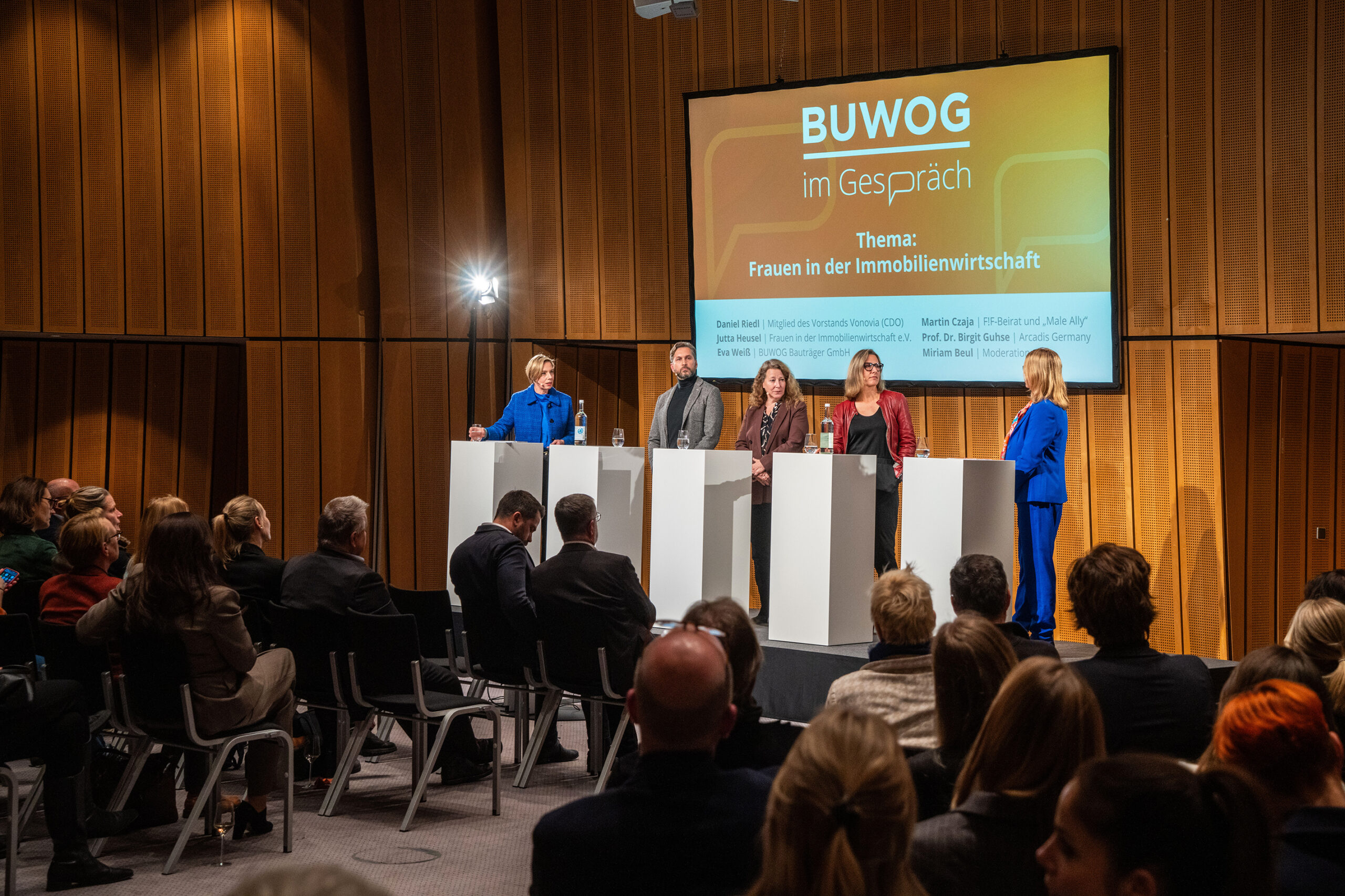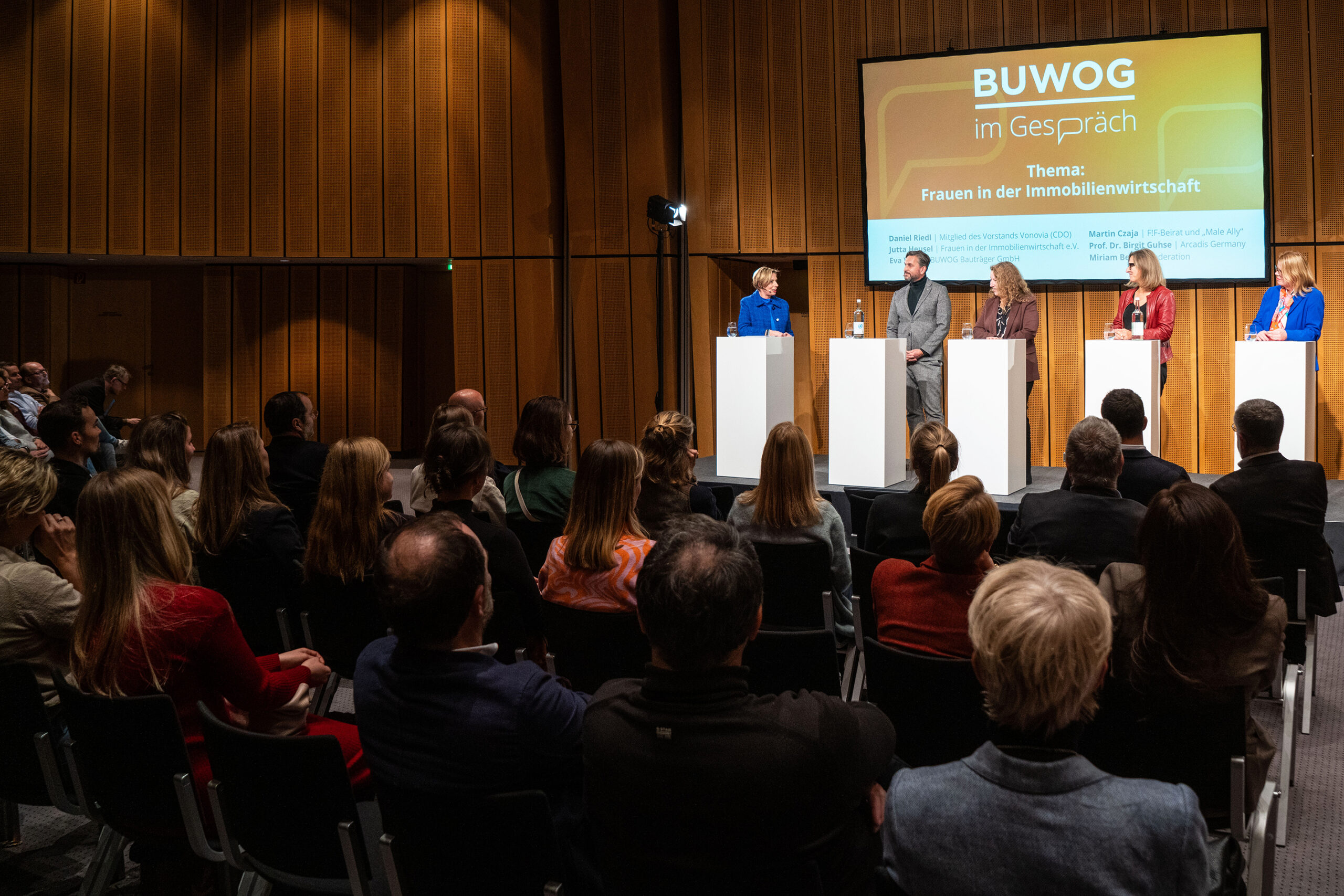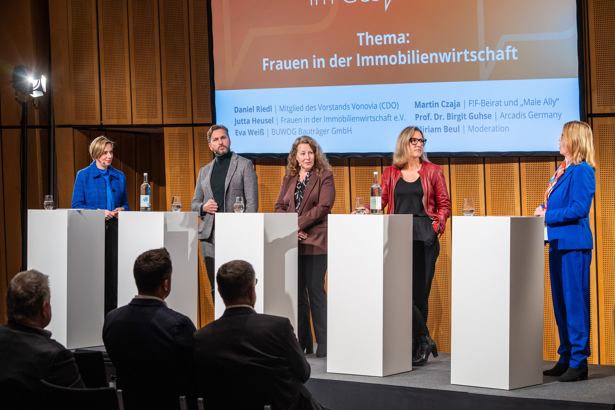 Auf dem Podium diskutierten anschließend Eva Weiß (BUWOG-Geschäftsführerin), Martin Czaja von GARBE Insite, Prof. Dr. Birgit Guhse (ARCADIS Germany) und Jutta Heusel. Die Expert:innen beleuchteten die Situation von Frauen in der Branche, sprachen über Chancen und Hürden und formulierten auch konkrete Lösungsideen um die Situation weiter zu verbessern. Der Abend zeigte deutlich, dass die Immobilienbranche Fortschritte macht, aber noch viele Aufgaben vor sich hat.