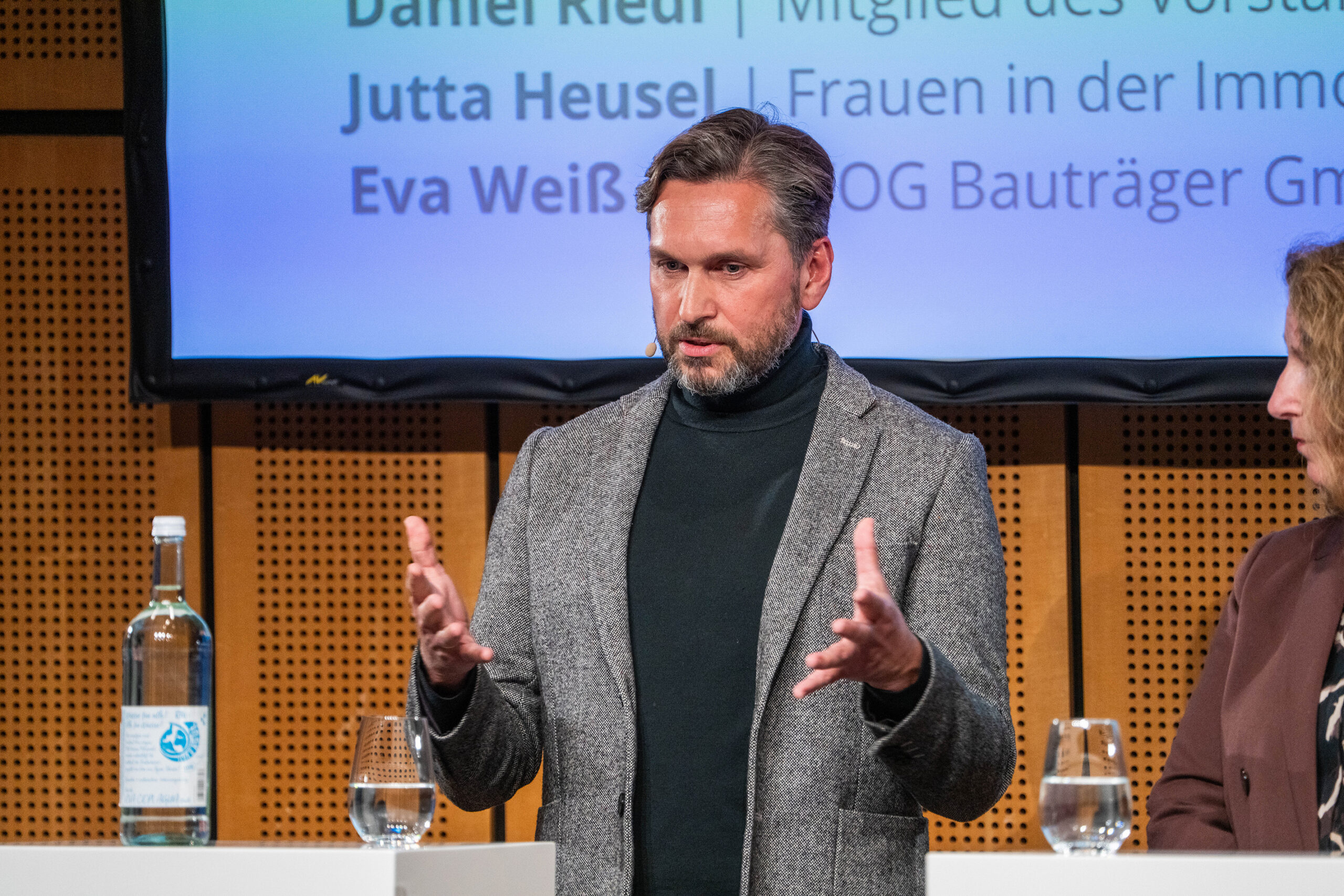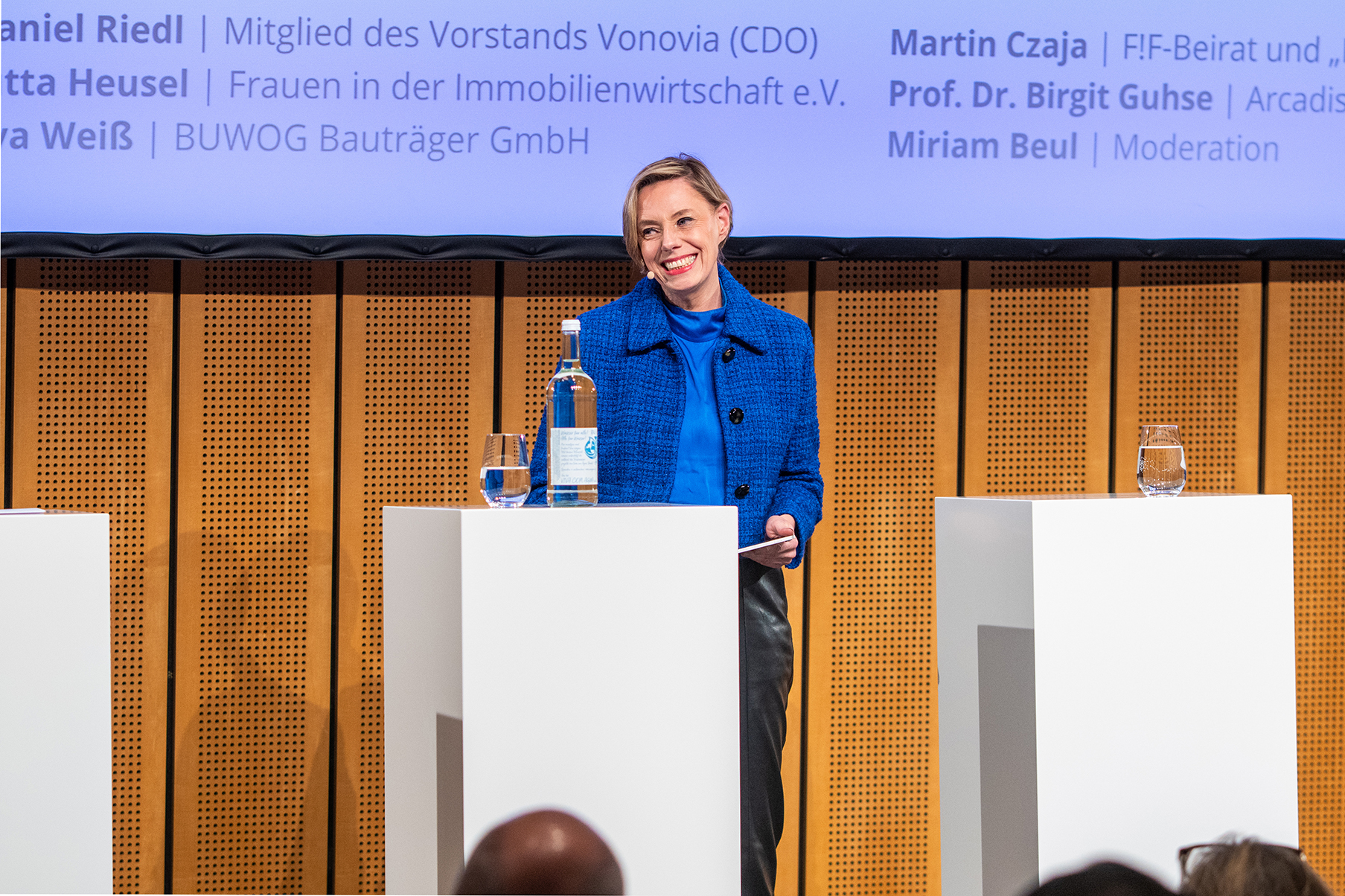 Rund 150 Gäste aus Wirtschaft, Wissenschaft und Politik diskutierten unter der Leitung von Miriam Beul über Karrierewege, strukturelle Barrieren und notwendige Veränderungen in der Branche. Die Veranstaltung wurde durch Daniel Riedl eröffnet, Mitglied des Vorstands von Vonovia und verantwortlich für das Development der BUWOG. Einen fachlichen Impuls setzte anschließend Jutta Heusel, Managing Director bei KOLLMANNSPERGER Executive Search und Vorstandsvorsitzende von Frauen in der Immobilienwirtschaft e. V., ein Netzwerk, das seit mittlerweile 30 Jahren existiert und sich erfolgreich in die Debatten einbringt. Jutta Heusel sieht aktuell eine Entwicklung, die sie mit Sorge betrachtet. Panels und Vorstandsfotos seien wieder überwiegend männlich besetzt, auch reine „Männer-Panels“ auf Messen könne man wieder finden. Ihr Appell war deutlich: Unternehmen müssen ihre Kultur öffnen und Veränderungen von innen heraus anstoßen, um authentischen Fortschritt zu erreichen. Um zukünftig talentierte Frauen noch besser sichtbar zu machen, bietet der Verein auf der Webseite sogar einen eigenen Pool an mit Referentinnen zur verschiedene Fachthemen der Immobilienbranche.